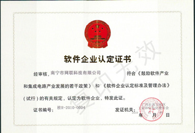 《軟件企業認定證書》證書編號:桂R-2010-0024《軟件產品登記證書》證書編號:桂DGY-2010-0058